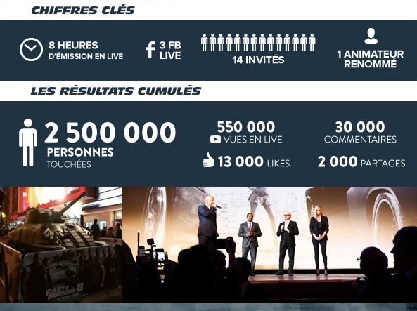 À l’occasion de la sortie de Fast and Furious 8 de F. Gary Gray, Universal a créé l’événement en relevant un sacré défi : un Facebook Live de 8h, spécialement consacré à l’avant-première du film à Paris.
