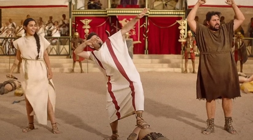 Ajoutons à cela, le fait qu’il est difficile d’ignorer le fait que Brutus vs César fait l’effet d’une sous-copie d’un certain Astérix : Mission Cléopatre, un film toujours aussi efficace depuis 2002 et réalisé par Alain Chabat à l’époque. En fait, c’est même pire que ça : Brutus vs César fait penser à Astérix et Obélix : Au service de sa Majesté de Laurent Tirard (2012), qui déjà essayait de faire une copie du film d’Alain Chabat. Et comme on a pas beaucoup de péplum français de référence (et qu’un seul Alexandre Astier), c’est quasiment impossible de ne pas faire le lien ni de ne pas tendre l’oreille pour entendre la mention d’un des célèbres Gaulois – autant vous le dire de suite, ce ne sera pas le cas, Kheiron se cantonne aux personnages connus ayant un poil existé (et heureusement).