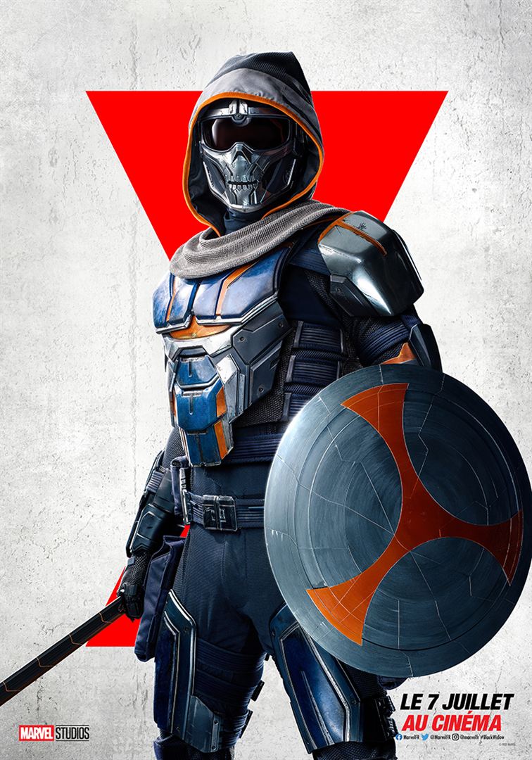 Entre donc en scène la fameuse fille de Dreykov que l’ont pensait morte depuis toujours, transformée en une arme et manipulée pour être asservi. Entrainée au combat et nourrie par des vidéos où elle a pu observer les techniques de combats des Avengers, ses apparitions en Taskmaster font grimper l’adrénaline-o-mètre, tant on retrouve des gestuelles bien connues. Elle copie évidemment Natasha, mais en observant bien, vous retrouverez des gimmicks appartenant à certains Avengers, du tir à l’arc d’Hawkeye jusqu’aux griffes de Black Panther. Merci les images de l’aéroport, tirées de Captain America – Civil War !