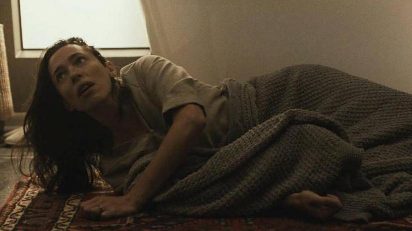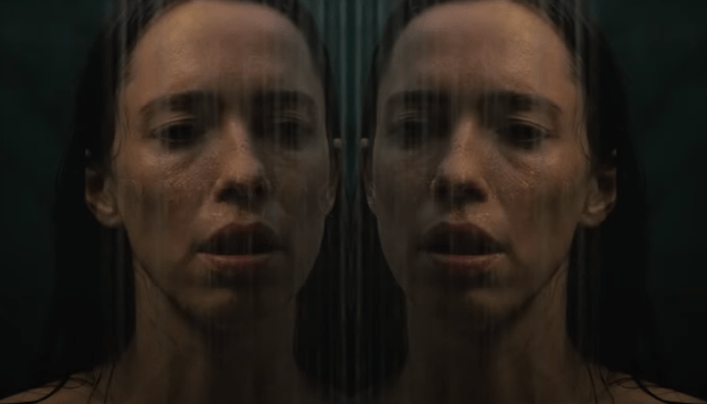 En effet, La Proie d’une Ombre est loin des films démonstratifs et truffés de jumpscares qui ont inondé nos écrans ces dernières années. David Bruckner préfère un format à l’ancien, plus lent et plus rythmé par le suspens frissonnant alors que sa mise en scène installe habilement chaque moment de frayeur. Le réalisateur joue avec son environnement, entre les jeux de miroirs, d’ombres ou de superpositions des champs. L’ambiance du film est très sombre, presque monolithique, comme un long rêve ou cauchemar sans issue, souligné par une musique lancinante qui vient accentuer la fébrilité du personnage principal. J’ai apprécié les scènes où l’arrière-plan se révèle de manière inattendue pour mieux nous faire sursauter : le film fonctionne grâce à sa façon de surprendre autrement qu’avec des portes qui claquent ou autres jumpscares trop usés.