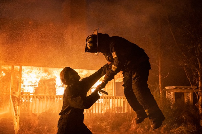 Alors que ce nouveau chapitre se situe seulement quelques minutes après la fin du film précédent, Halloween Kills choisit d’élargir sa bulle meurtrière et lâche toute la ville sur les traces du tueur. Grâce à quelques faux flashback, le film parvient à réunir le passé et le présent en réintégrant des survivants des premiers films (dont la Real Housewife de Beverly Hills, Kyle Richards) à la bataille. Bousculé par la démultiplication des personnages, David Gordon Green ne sait plus où donner de la tête et cela se ressent dans son montage qui devient décousu à force de passer d’une scénette à l’autre, comme dans un mauvais téléfilm. Du coup, la tête d’affiche du film (Jamie Lee Curtis) passe étrangement au second plan pour devenir une sorte de voix off aux messages cryptiques, tandis que le reste de la ville bascule dans une déferlante de violence aux allures de manifestation white trash haineuse. Tous ces apartés donnent souvent lieu à des moments maladroits, accentués par une musique (supervisée par John Carpenter himself) à peine subtile ou des cuts sensés dynamiser des dialogues révélateurs. Oui mais voilà, la superposition est un exercice de style délicat qui n’est pas fait pour les amateurs et qui peut rapidement virer au ringard. Ici, Halloween Kills frôle le risible à certains moments, devenant drôle malgré lui quand on se retrouve face à des ambiances téléphonées ou des réactions presque caricaturales (comme une actrice qui crie « WHAT? » avec la finesse digne d’une telenovela).