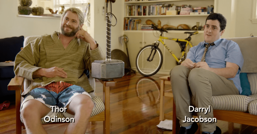 Par contre, un visage qui doit vous rappeler quelque chose, c’est celui de Daley Pearson qui reprend son rôle de Darryl : souvenez-vous, c’était le colocataire que squattait Thor quand on essayait de nous expliquer ce qu’il fichait pendant Captain America Civil War. Ici, il est devenu guide touristique à New Asgard.