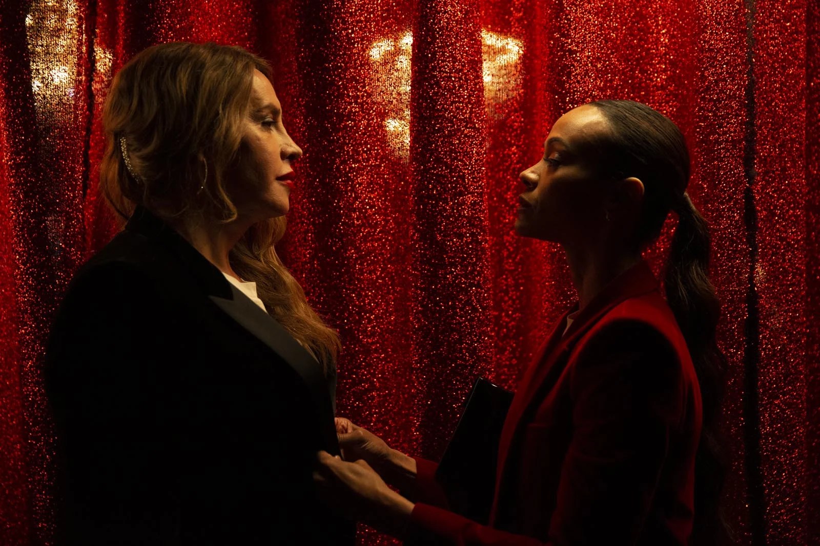 Jacques Audiard réussit ici un véritable tour de force, en mêlant la violence crue du crime organisé au sujet sensible de la transidentité, le tout enveloppé dans l’esthétique de comédie musicale aux effluves latines, tantôt entraînantes, tantôt poignantes. Les scènes sont à la fois brutales et magnifiquement chorégraphiées, créant un contraste saisissant avec les thèmes abordés, qui résonne tout au long du film. Chaque tableau est une explosion d’émotions, porté par des chansons qui touchent en plein cœur. Les décors spectaculaires et la photographie captivante enrichissent l’expérience visuelle, renforçant l’impact émotionnel de chaque moment (notamment Zoé Saldaña en costume rouge, sur les tables d’un banquet chic plongé dans la pénombre : un régal !).